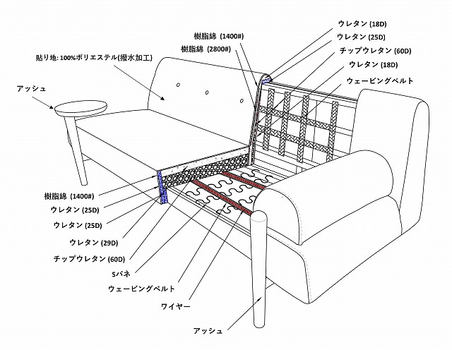 シート下は、29Dの高密度ウレタンを使用し、その下に60Dの超高密度ウレタンのチップを使用しています。