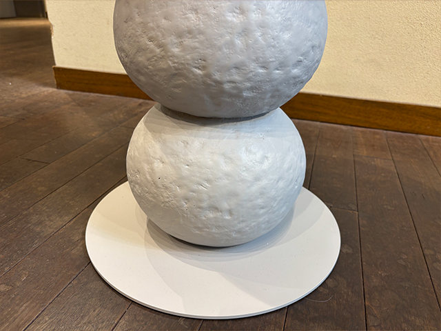 2つの丸い球体の上には、その球体を大きくして2つに割ったような形状の天板が載っています。