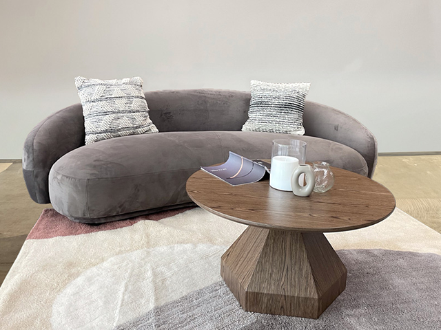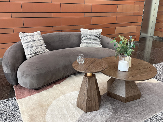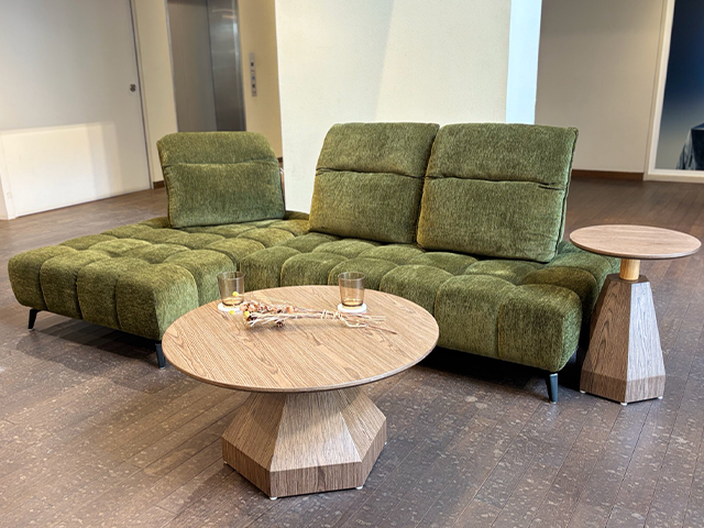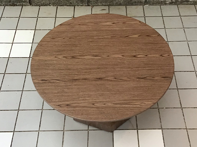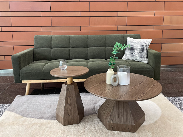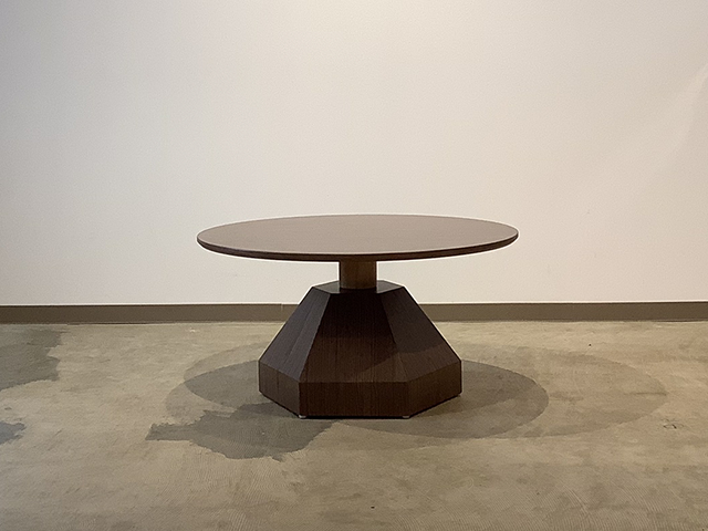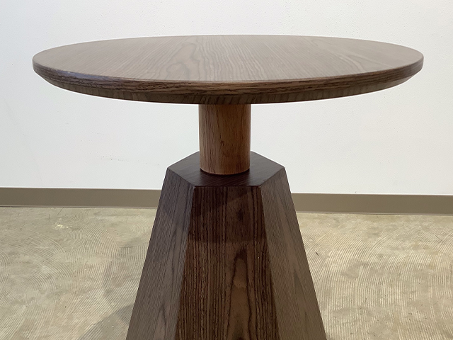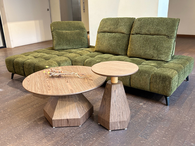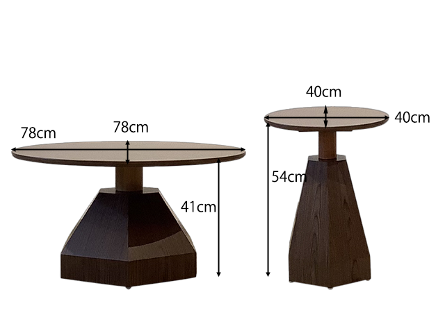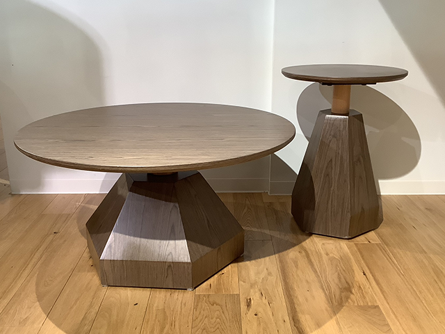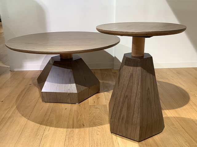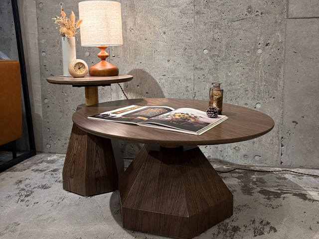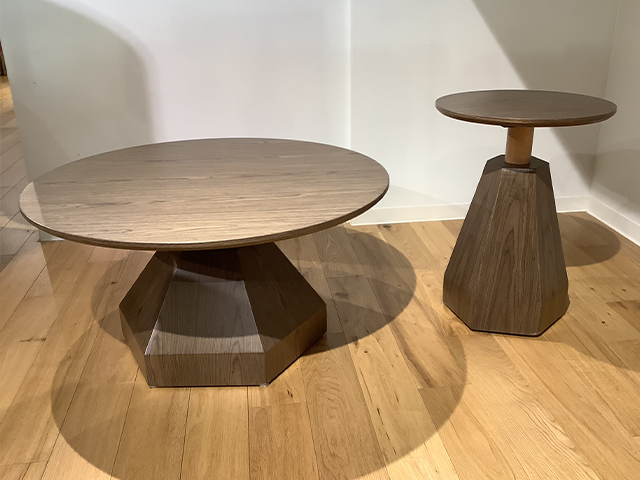 コーヒーテーブルとサイドテーブルのご紹介 六角錐の脚に円形天板と天然木の共演