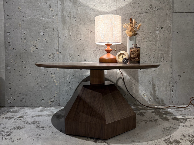 シュールな六角錐の脚と円形天板の2つのテーブル、そのアシンメトリーなデザイン、雰囲気、使い勝手、是非NOCE各店にてお確かめいただければと思います。