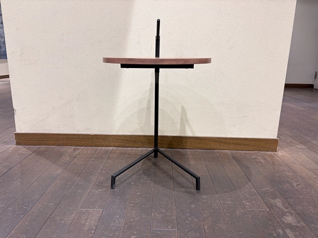 ステムに載せられた木製天板と脚の三角形が作るフォルムは、異素材の融合とデザインが生み出すシュールな世界になっています。