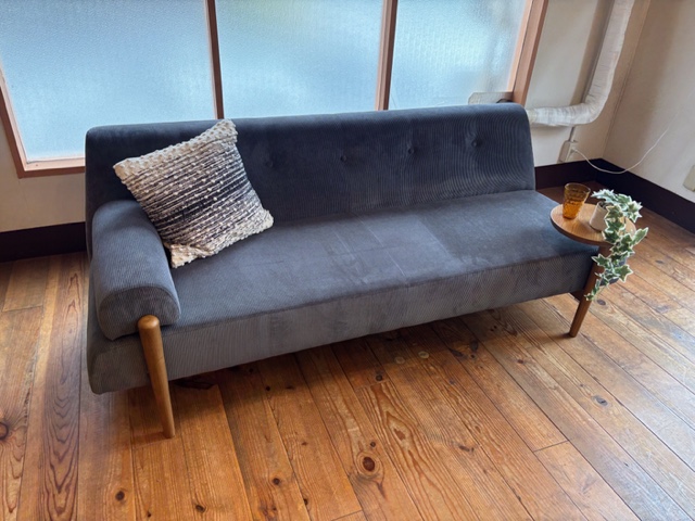 生地はコーデュロイで背もたれ部分にくるみボタンがあり、可愛らしいソファかと思えば深みのあるグレーのカラーと天然木の脚で少し大人っぽい雰囲気もあります。