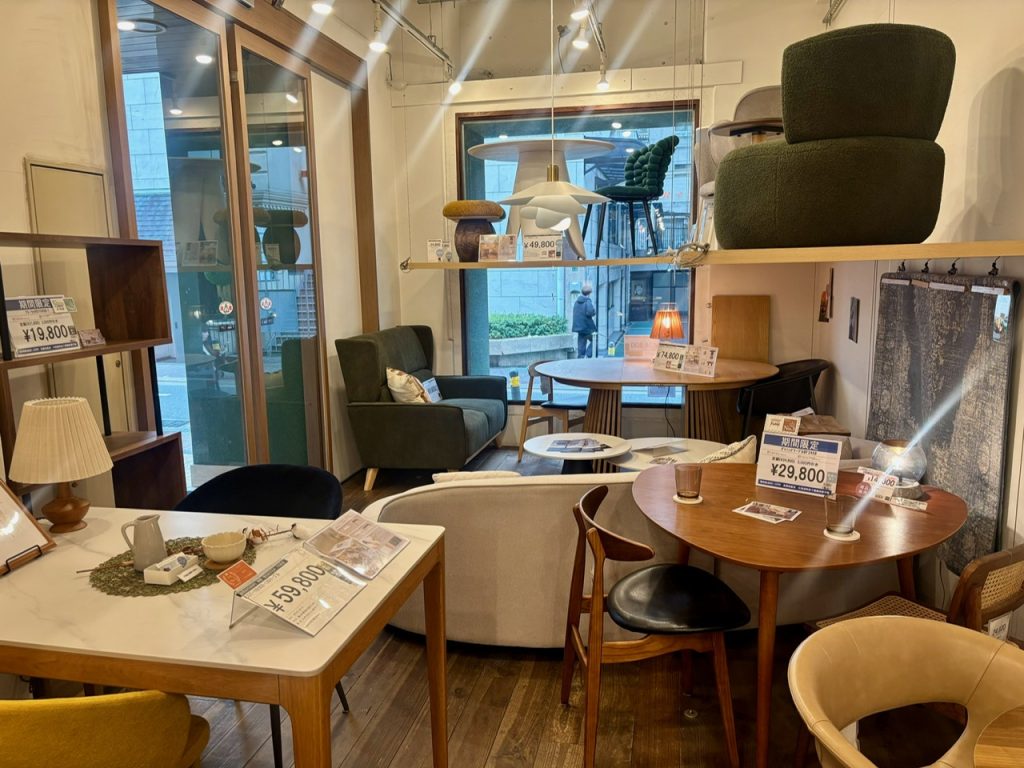 店内は棚板を設置し、数多くの家具を隅々まで展示しております。