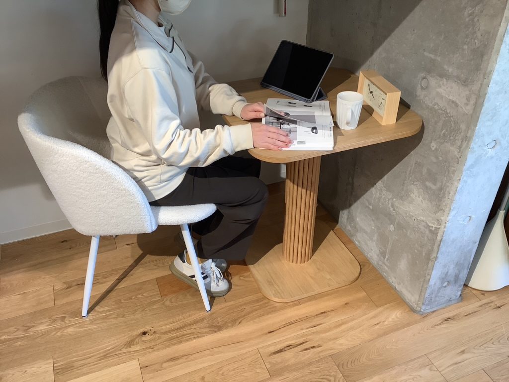 天板が丸く縁取っているため、天然木との柔らかな印象も残しつつ調和をとれているデザインです。