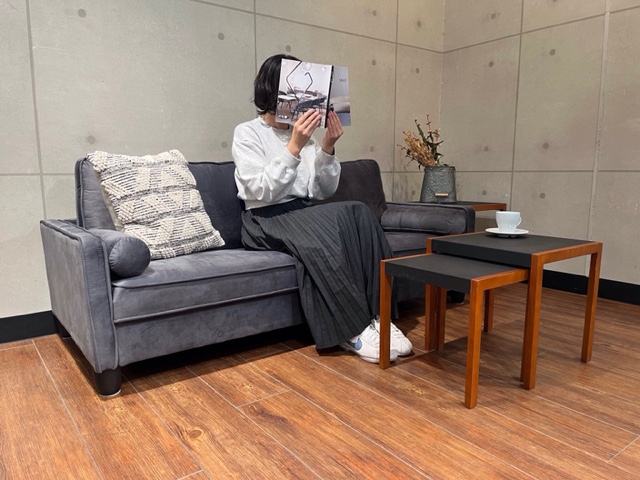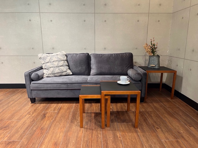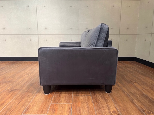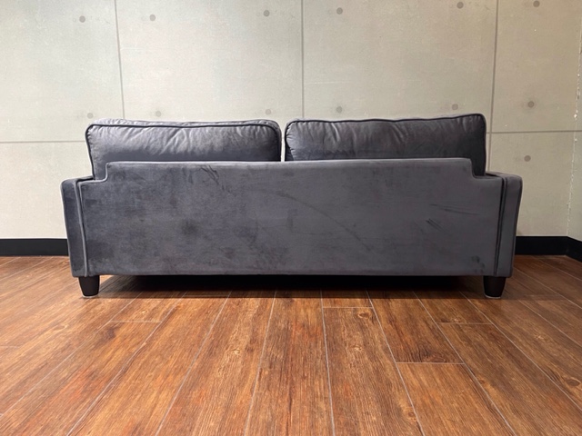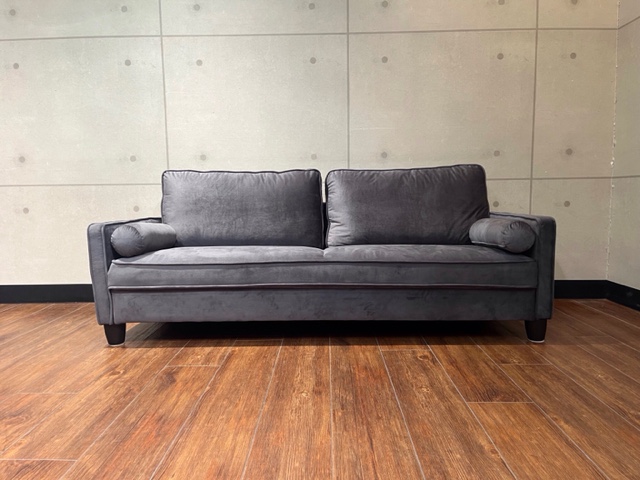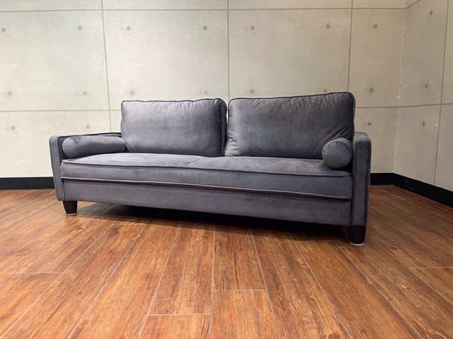 セールアイテムのご紹介、シンプルなデザインとベルベット素材の組み合わせがおしゃれなソファ