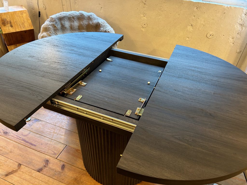伸長用の天板は中央に折りたたまれて収納される格納型仕様となっており、引き出して広げるだけで円形から楕円形へ簡単にサイズ変更ができます。