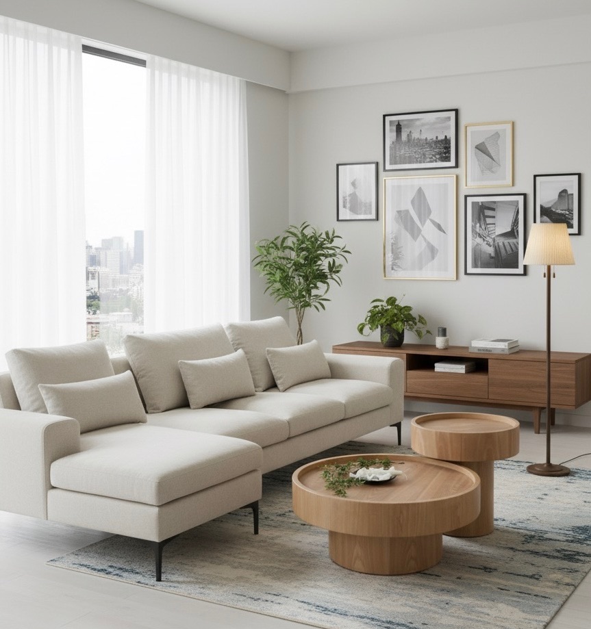 脚の太さと天板の厚みのバランスが美しく見えるよう設計されており、丸く柔らかいデザインのため、ソファの形を選ばず、ナチュラルにもモダンにも馴染みます。
