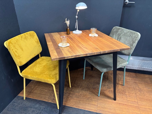 イエローとグリーンで色味はあるもののテーブル天板とチェアの座面、背面の形を揃えることで、カジュアルになりすぎず飽きのこないコーディネートです。
