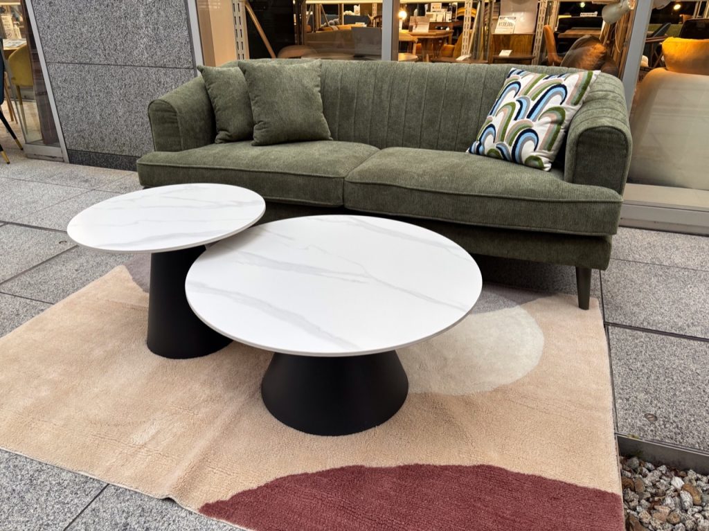 大理石調でブラックスチール脚のローテーブルを置き、引き締まり効果もございます。
