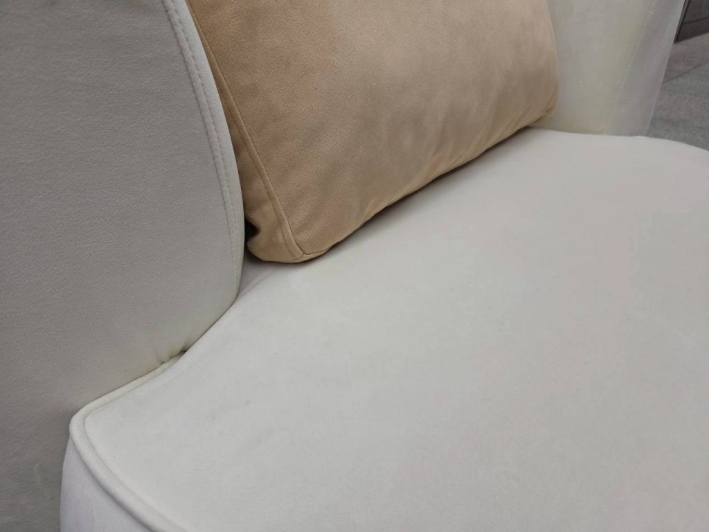 白と淡いブラウンカラーの、シンプルながらも存在感のあるソファです。