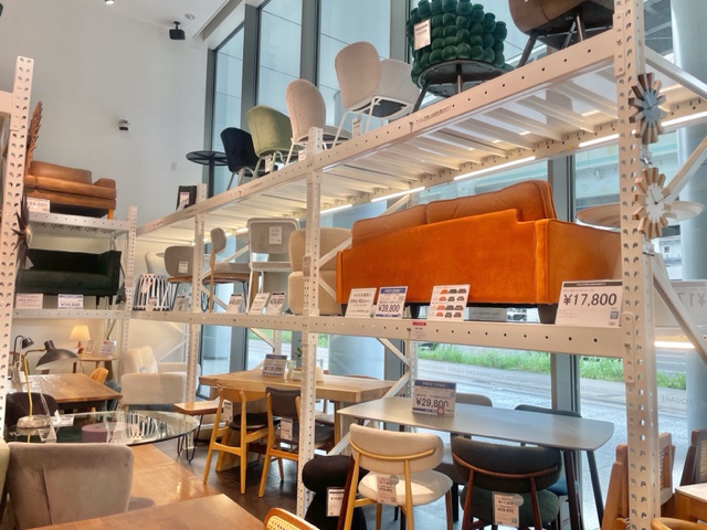当店は高い天井を活かした3段積みの展示ラックが特徴で、関東の店舗の中でも展示数が豊富な店舗です。2段目の商品や3段目のチェアももちろん実際にお試しいただけますので、お気軽にスタッフまでお申し出ください。