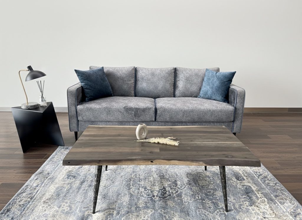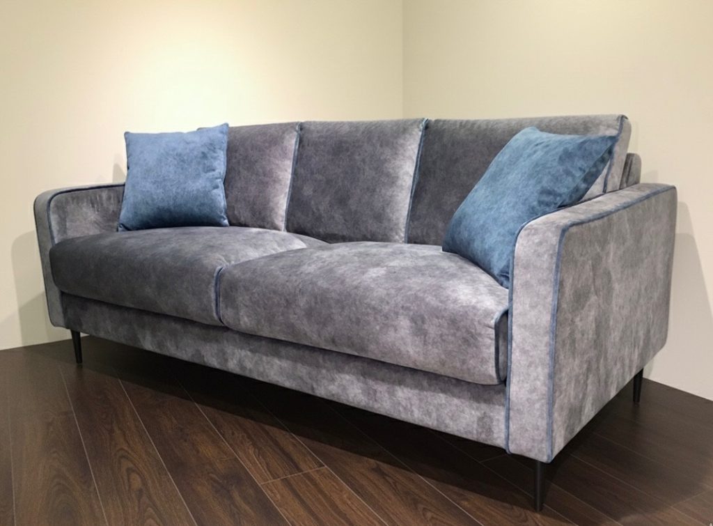 ベルベット生地のような上品な質感とアクセントにブルーのクッションとパイピングの立体感が高級さを感じさせます。シンプル形のたお部屋に溶け込みやすく、ホテルライクなインテリアに初めて挑戦するかたのもおすすめです。