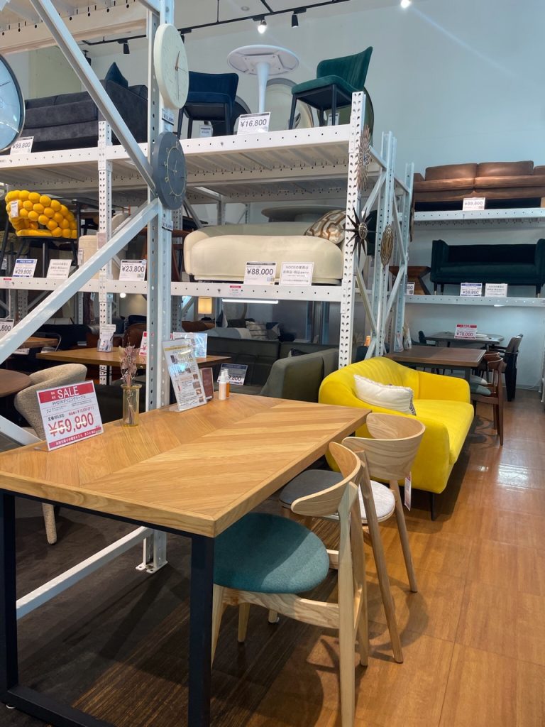 当店は高い天井を活かした3段積みの展示ラックが特徴で、関東の店舗の中でも展示数が豊富な店舗です。2段目の商品や3段目のチェアももちろん実際にお試しいただけますので、お気軽にスタッフまでお申し出ください。