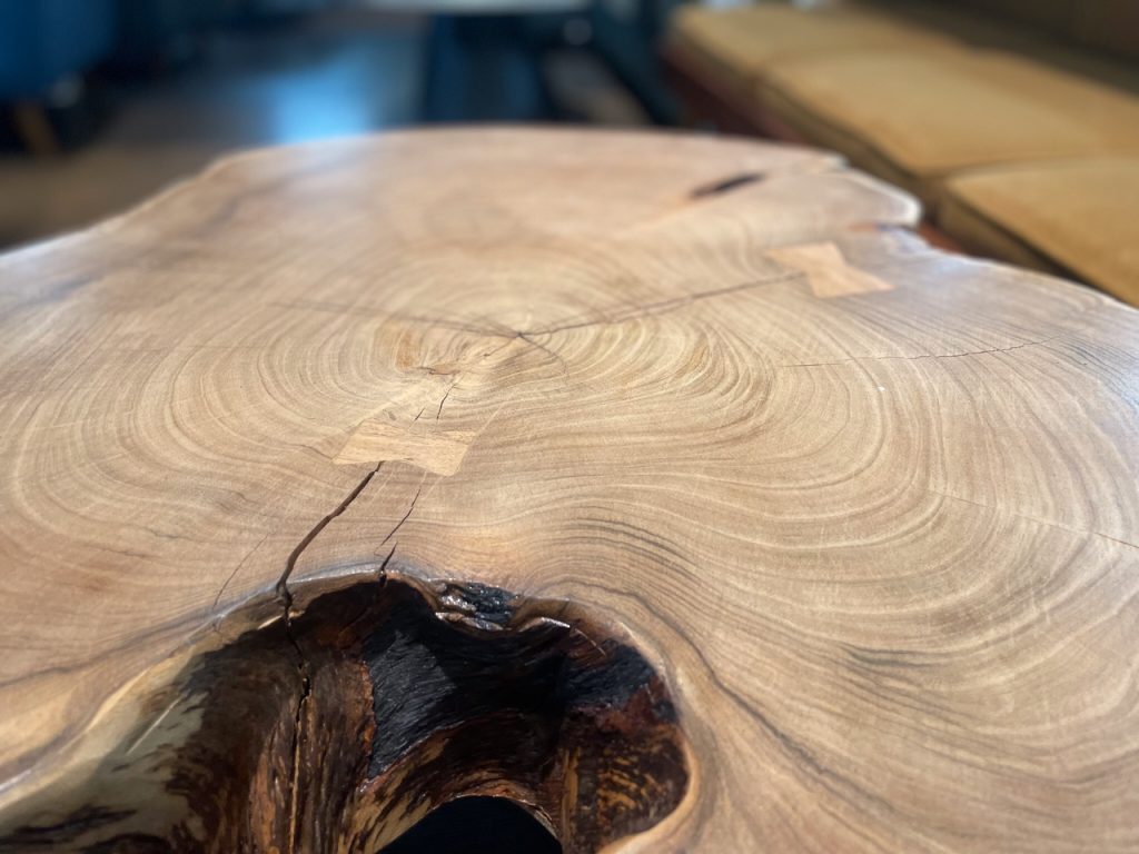 今回のものは、リボン形のちぎり(天板の割れを抑えるための加工)が2つあり、ちょっとしたアクセントに!亀裂や大きめの節が特徴的でかっこいい印象です。