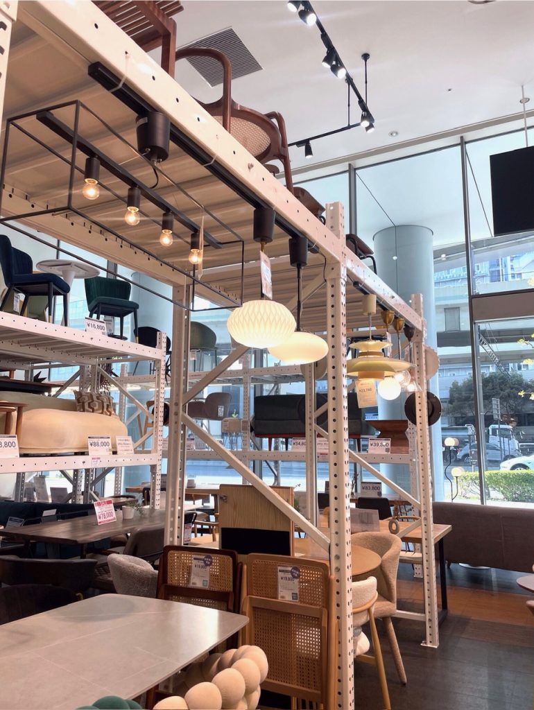 当店は高い天井を活かした3段積みの展示ラックが特徴で、関東の店舗の中でも展示数が豊富な店舗です。2段目の商品や3段目のチェアももちろん実際にお試しいただけますので、お気軽にスタッフまでお申し出ください。