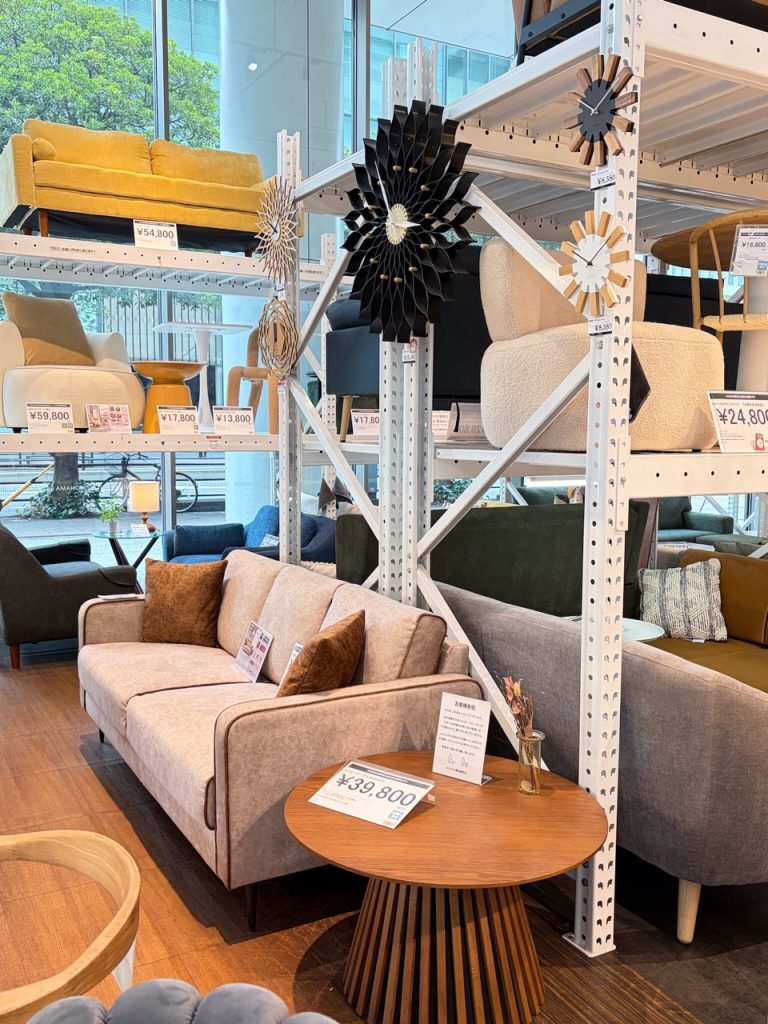 当店は高い天井を活かした3段積みの展示ラックが特徴で、関東の店舗の中でも展示数が豊富な店舗です。2段目の商品や3段目のチェアももちろん実際にお試しいただけますので、お気軽にスタッフまでお申し出ください。